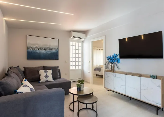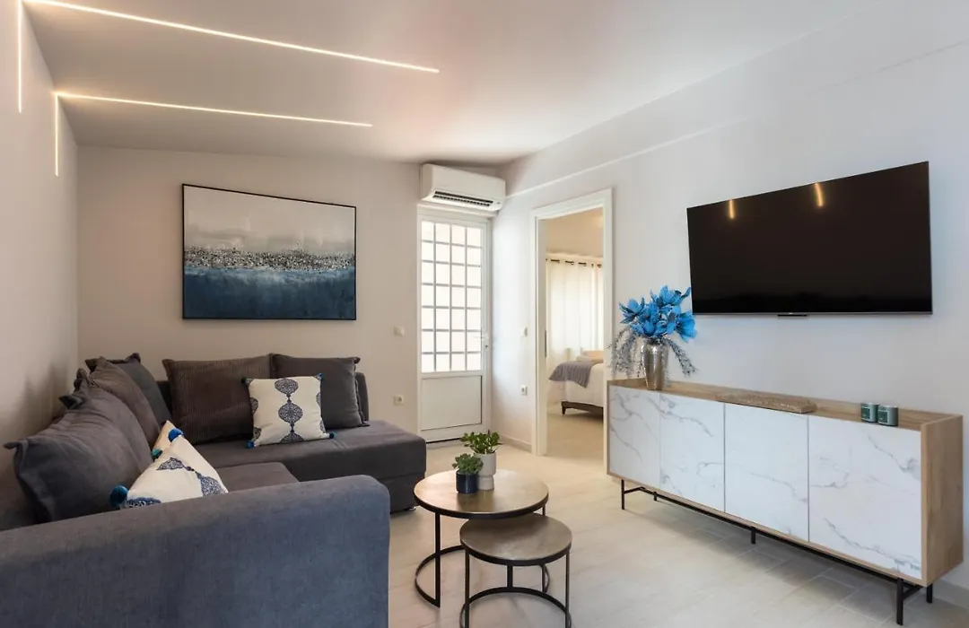 Daire Korfu şehir merkezine yürüyerek 15 dakika uzaklıktadır. Daire, Aqualand Corfu Water Park'a 7 km uzaklıktadır. Tesise 350 metre mesafede yer alan ve Yunan mutfağı sunan Beach Bar Blue Bay mevcuttur. Daire, Aziz Spyridon Kilisesi'den kısa sürüş mesafesinde yer almaktadır.